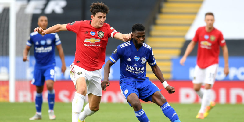 LEICESTER, ENGLAND - JULY 26: Kelechi Iheanacho of Leicester City is challenged by Harry Maguire of Manchester United during the Premier League match between Leicester City and Manchester United at The King Power Stadium on July 26, 2020 in Leicester, England.Football Stadiums around Europe remain empty due to the Coronavirus Pandemic as Government social distancing laws prohibit fans inside venues resulting in all fixtures being played behind closed doors. (Photo by Michael Regan/Getty Images)