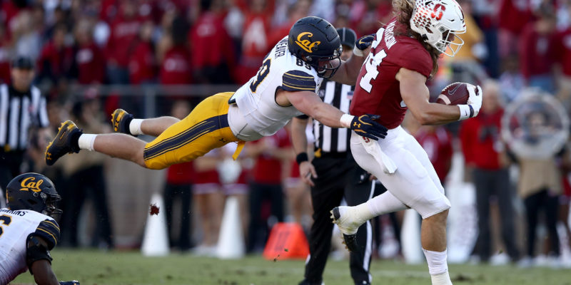 PALO ALTO, CALIFORNIA - NOVEMBER 23: Evan Weaver #89 of the California Golden Bears dives to tackled Colby Parkinson #84 of the Stanford Cardinal at Stanford Stadium on November 23, 2019 in Palo Alto, California. (Photo by Ezra Shaw/Getty Images)