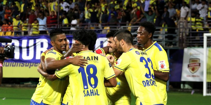 Kerala Blasters FC players celebrates a goal during match 29 of the Indian Super League ( ISL ) between the Kerala Blasters FC and FC Goa held at the Jawaharlal Nehru Stadium, Kochi, India on the 1st December 2019. Photo by: Vipin Pawar / SPORTZPICS for ISL